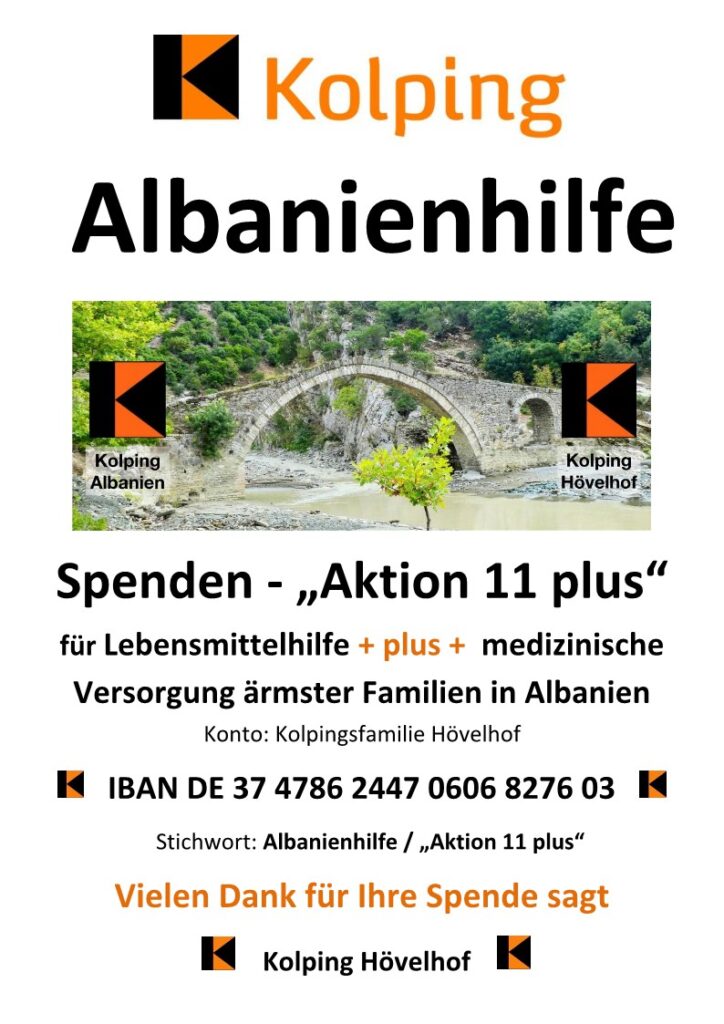 Der AK-Albanien der Kolpingsfamilie führt jeweils im Advent die „Aktion 11 plus“ durch sowie im Laufe des Jahres weitere Veranstaltungen, um Spenden für die Albanienhilfe zu erhalten.