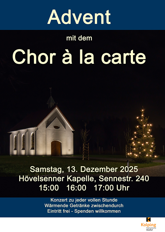 Das Adventssingen ist vorrraussichtlich wieder in der Hövelsenner Kapelle, Uhrzeiten und Ort werden noch genau bekanntgegeben. Bitte erst einmal den Termin: Samstag, 26. November vormerken.