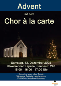 Zu unseren kleinen kostenlosen Konzerten in der Hövelsenner Kapelle diesmal am Vorabend des dritten Advents laden wir herzlich ein! Immer zur vollen Stunde um 15:00, 16:00 und 17:00 Uhr wird ein etwa halbstündiges, weihnachtliches Konzertprogramm mit Liedern aus alter und moderner Zeit unter der Leitung von Volker Kukulenz geboten. Das idyllische Ambiente der Kapelle und die Nähe von Publikum und Sänger/innen erzeugen eine ganz besondere Stimmung. Singt gern mit, das macht die vorweihnachtliche Atmosphäre komplett.